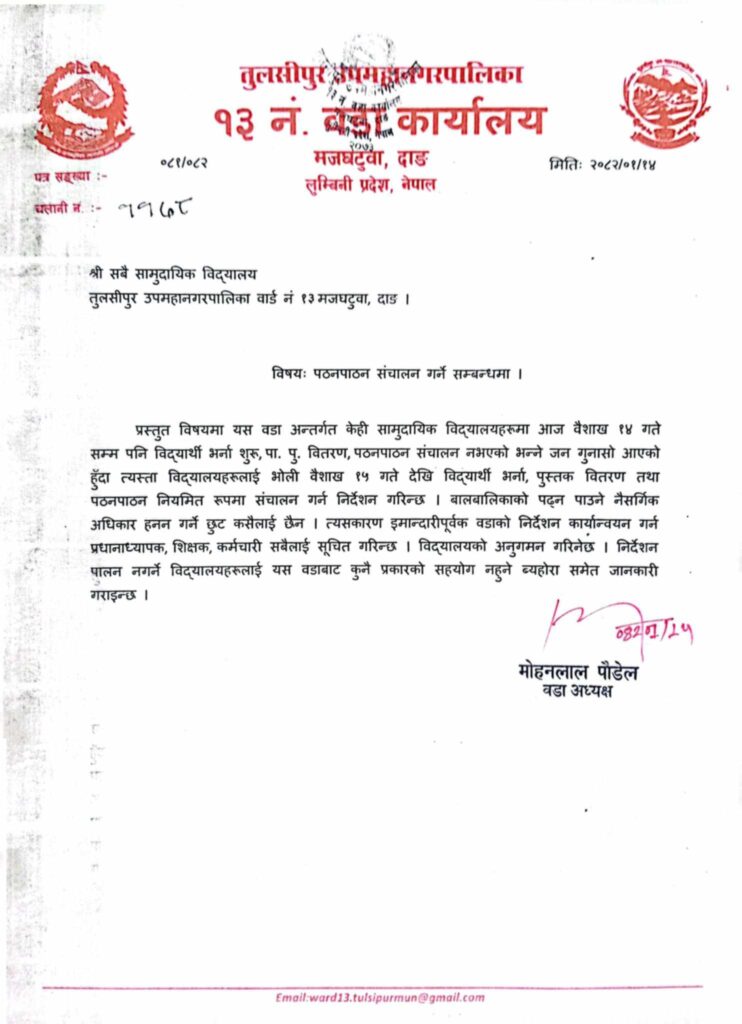 तुलसीपुर । दाङको तुलसीपुर उपमहानगरपालिका वडा नंम्बर १३ ले सामुदायीक विद्यालयलाई नियमित पठनपाठन सञ्चालन गर्न निर्देशन दिएको छ । वडा कार्यालयले आज आइतबार एक सूचना जारी गर्दै विद्यालयलाई नियमित पठनपाठन सञ्चालन गर्न निर्देशन दिएको हो ।