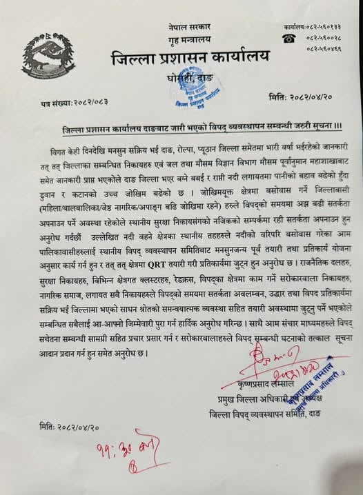 दाङ जिल्ला भएर बग्ने बबई र राप्ती नदीको लगायतमा जलस्तर सतर्कता सीमाभन्दा माथि पुग्ने सम्भावना रहेकोले डुबान र कटानको उच्च जोखिम रहेको मौसम विज्ञान विभाग मौसम पूर्वानुमान महाशाखाबाट जानकारी प्राप्त भएको प्रमुख जिल्ला अधिकारी लम्सालले जानकारी दिनुभएको छ ।