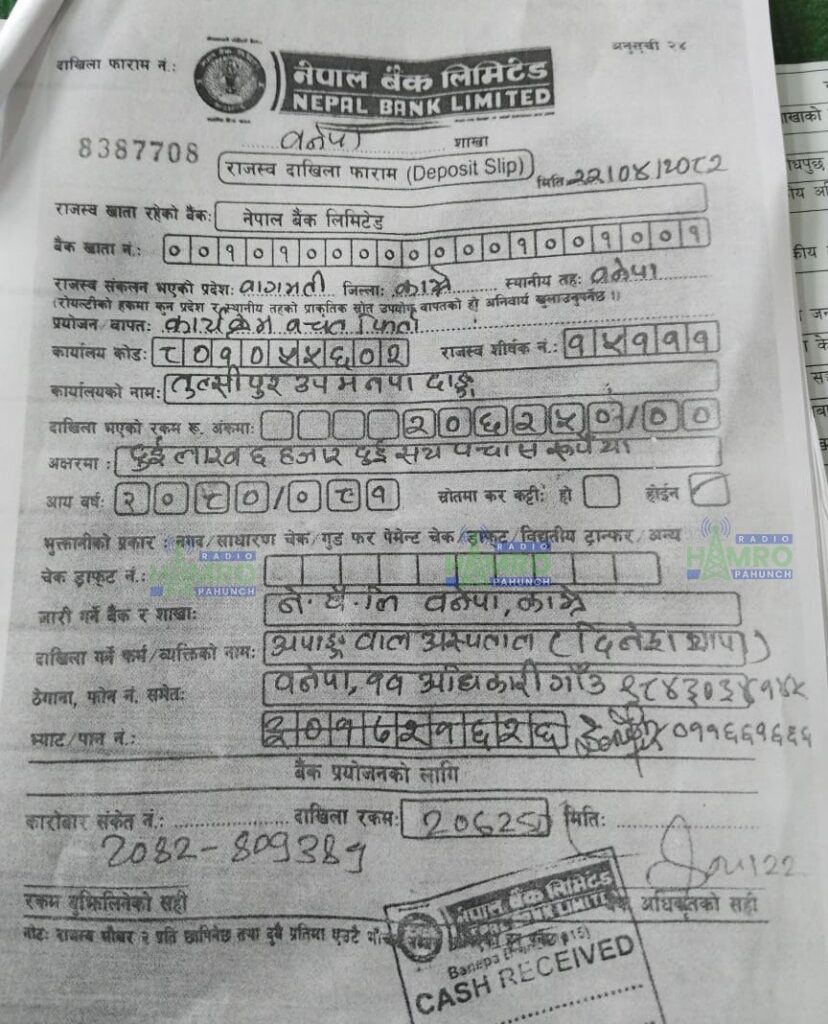 एचआरडिसीले तुलसीपुर उपमहानगरपालिकाको खातामा बिहिबार (साउन २२ गते) उक्त रकम जम्मा गरिदिएको हो । रेडियो हाम्रो पहुँचलाई प्राप्त भौचर विवरण अनुसार एचआरडिसीले तुलसीपुर उपमहानगरपालिको नेपाल बैंकमा रहेको खातामा रकम जम्मा गरेको देखिएको छ ।