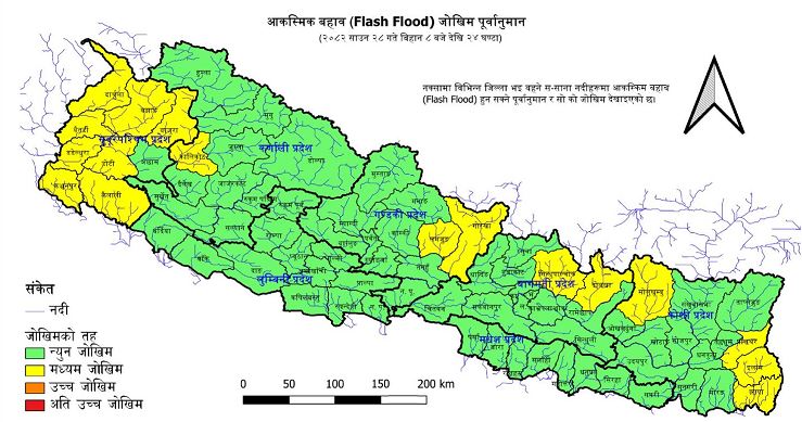 त्यसैगरी कर्णाली प्रदेशको कालीकोट, डोल्पा तथा सुदूरपश्चिम प्रदेशका, बाजुरा ,बझाङ, बैतडी, डडेलधुरा, डोटी, कैलाली, कञ्चनपुर, दार्चुलामा बाढीको मध्यम जोखिम रहेको छ ।