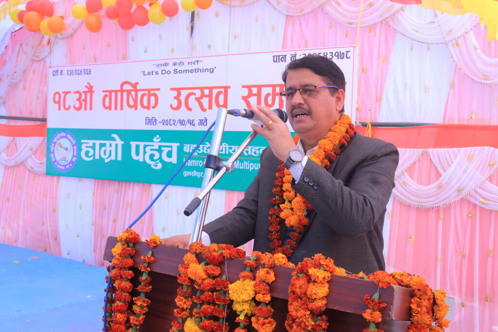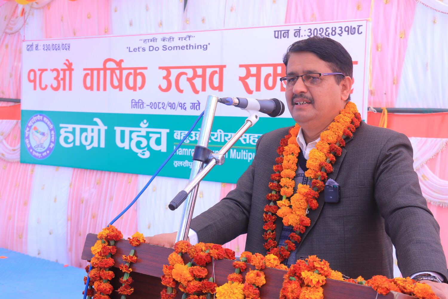 दाङको तुलसीपुरमा रहेको हाम्रो पहुँच बहुउद्देश्यीय सहकारी संस्था लिमिटेडको १८ औँ वार्षिकोत्सव समारोहलाई आज शुक्रबार सम्बोधन गर्नुहुँदै वरिष्ठ उपाध्यक्ष पोख्ररेलले यस्तो बताउनुभएको हो ।