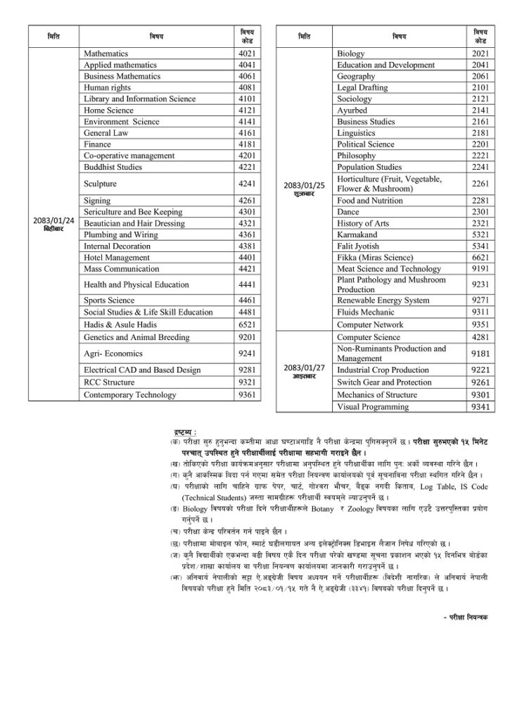 बैशाख १४ गते सोमबारदेखि शुरु हुने परीक्षा २७ गते आइतबारसम्म चल्नेछ । परीक्षा बिहान ८ बजेदेखि ११ बजेसम्म सञ्चालन हुने बोर्डले जनाएको छ । त्यसअघि एसईईको परीक्षा आउँदो चैत्र १९ गतेदेखि सञ्चालन हुनेछ ।