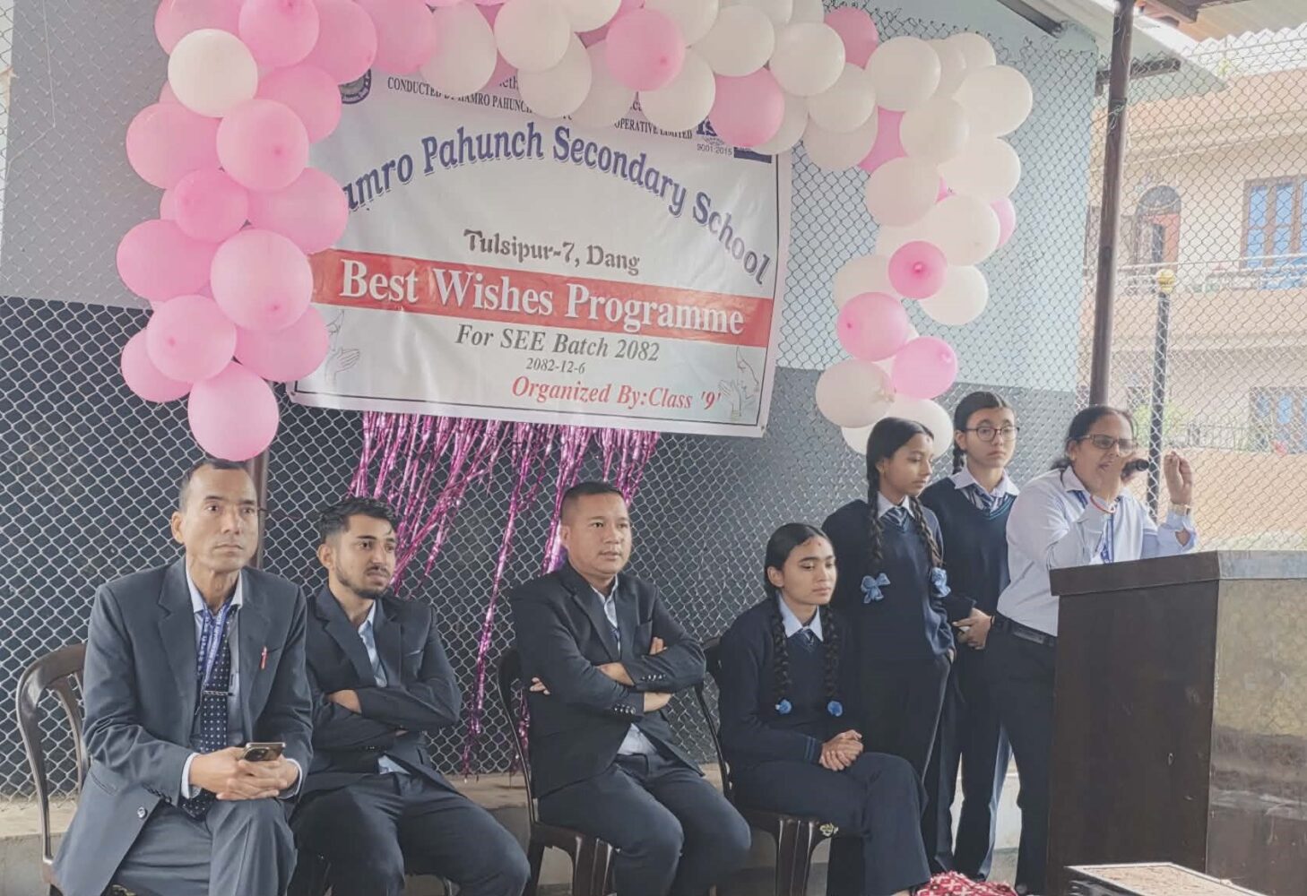 दाङ । दाङको तुलसीपुर–७ झुमरेमा रहेको हाम्रो पहुँच सेकेन्डरी स्कुलका एसईई परीक्षा दिने विद्यार्थीलाई लक्षित गर्दै शुभकामना कार्यक्रम सम्पन्न भएको छ । आज एक कार्यक्रमको आयोजना गरी कक्षा ९ का विद्यार्थीहरूले २०८२ सालको एसईई ब्याचका विद्यार्थीहरुलाई सफलताको शुभकामना व्यक्त गरेका हुन् ।