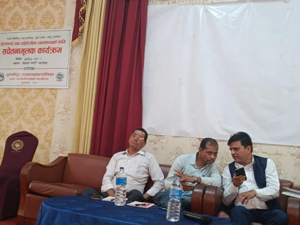 दाङ। तुलसीपुर उपमहानगरपालिकाको सरसफाई तथा फोहोरमैला व्यवस्थापन शाखाले टोल विकास संस्थाका पदाधिकारीहरूलाई जिम्मेवार बनाउन सरसफाई सचेतना कार्यक्रम गरेको छ ।